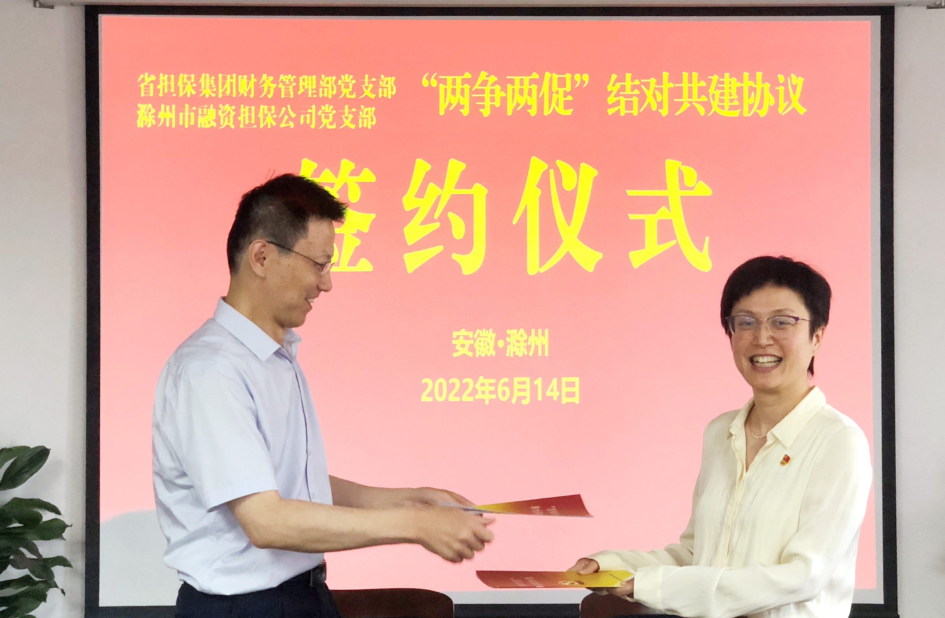 活動(dòng)中,雙方簽署了“兩爭(zhēng)兩促”結(jié)對(duì)共建協(xié)議,開(kāi)展了“傳承紅色基因 凝聚紅色力量”主題黨日活動(dòng),省擔(dān)保集團(tuán)還向我單位贈(zèng)送了黨建書(shū)籍。